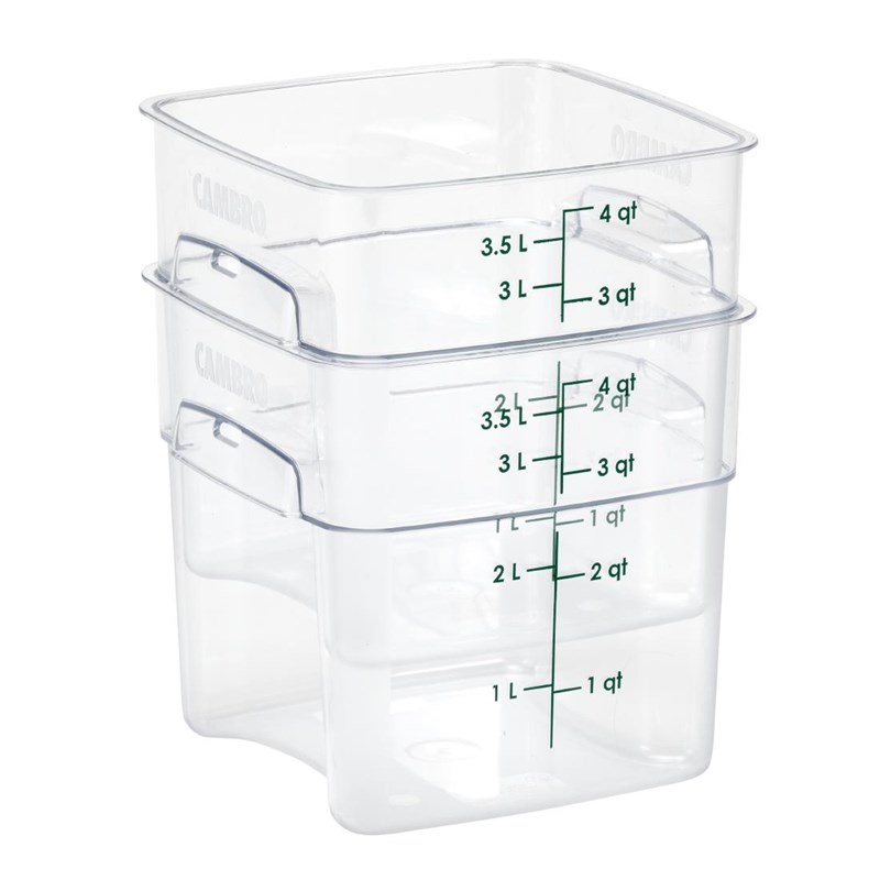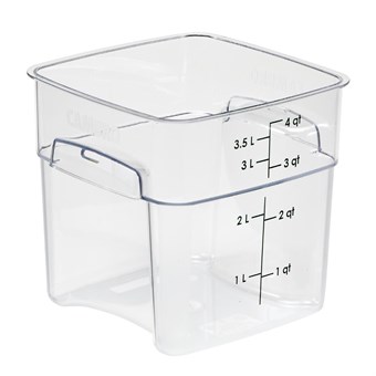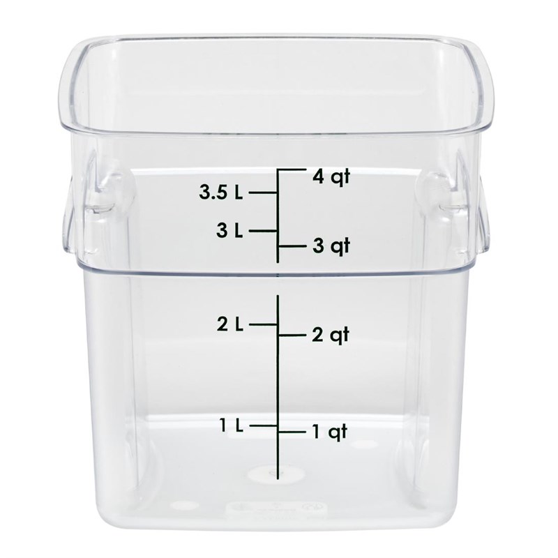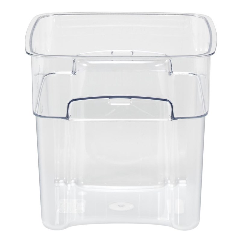 Les coins incurvés et la poignée texturée du FreshPro permettent un versement plus sûr sur quatre côtés et une manipulation plus facile. Le système à code couleur avec couvercles assortis (vendus séparément), égouttoirs et graduations faciles à lire permet un inventaire en un coup d'œil et une facilité d'utilisation, essentiel pour les cuisines professionnelles. Le récipient est très durable et résistant aux taches, aux acides et aux odeurs.