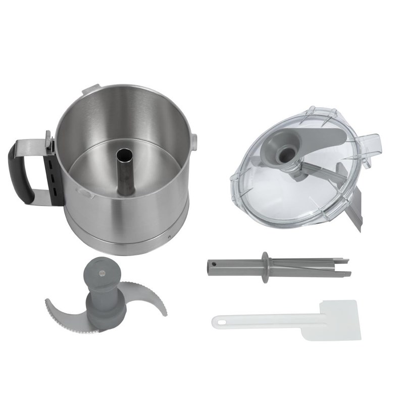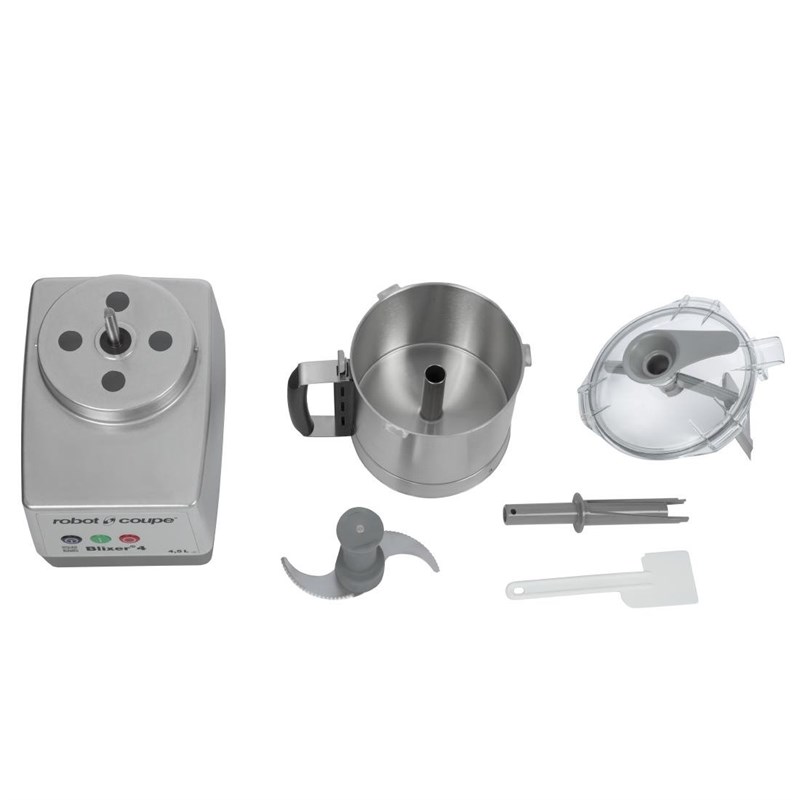 Le Blixer 4 de Robot Coupe est livré avec un couteau denté en inox, un couvercle à fermeture hermétique, une cuve en inox de 4,5 L, ainsi qu'un racle-bol et couvercle. Tous ces éléments peuvent être retirés de la base comprenant le moteur pour un entretien et un nettoyage facilités. Un système de sécurité magnétique et un frein moteur réduisent le risque de bless